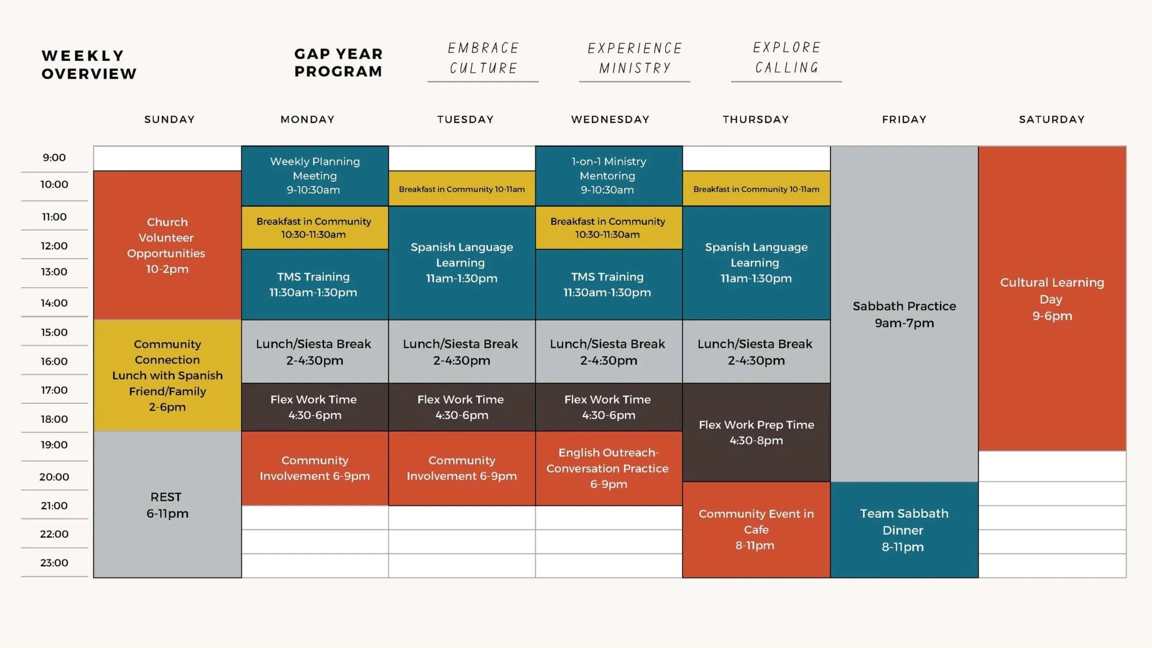 9 months — September through June. You'll start the fall with team building and training and finish the program equipped for life and mission in any context God calls you to.
